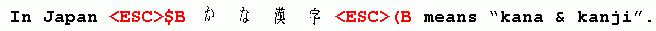 Los sistemas JIS utilizan caracteres de uno y dos bytes de ancho; el paso de un tipo a otro se señala mediante una secuencia de escape que pertenece al esquema de codificación y no forman parte del mensaje propiamente dicho. Ejemplo [3]: