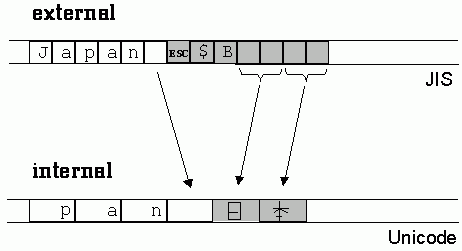 Debido a que los caracteres anchos se emplean generalmente para representación interna, y los multibyte para la representación externa, las operaciones de entrada/salida suelen implicar un proceso de conversión entre ambos sistemas de codificación. Un caso frecuente lo constituyen los procesos de lectura y escritura de ficheros. Estos últimos contienen generalmente caracteres multibyte, y cuando se lee un fichero, sus caracteres deben ser convertidos en caracteres anchos y situados en un almacenamiento interno donde puedan ser procesados. Evidentemente el sistema de caracteres anchos debe tener anchura suficiente para contener el carácter más ancho del sistema multibyte. En cambio, todas las secuencias de escape pueden ser eliminadas. La figura adjunta [3] muestra esquemáticamente el proceso de convertir un fichero de codificación JIS al sistema Unicode de caracteres anchos.