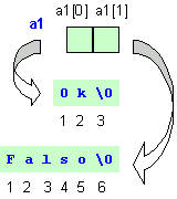 char a2[][7]= {"Ok", "Falso"}; // L2: matriz de caracteres (2 filas 7 columnas)
