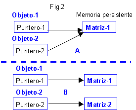 En determinados contextos esta política puede ser válida pero no exenta de inconvenientes. Por ejemplo, la destrucción de obj-1 supone la liberación del espacio ocupado por Matriz-1. ¿Que pasa con el puntero de Objeto-2 que señala a un sitio erróneo?.