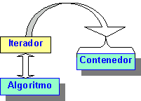 Como las estructuras de datos (contenedores) son clases genéricas, y los operadores (algoritmos) que deben operar sobre ellas son también genéricos (funciones genéricas), Stepanov y sus colaboradores tuvieron que desarrollar el concepto de iterador como elemento o nexo de conexión entre ambos. El nuevo concepto resulta ser una especie de punteros que señalan a los diversos miembros del contenedor (punteros genéricos que como tales no existen en el lenguaje). La figura 1 muestra esta relación. Este diseño ha permitido que los algoritmos adopten la forma de funciones globales que aceptan iteradores como argumentos, a través de los cuales puedan operar sobre los miembros del contenedor [1].