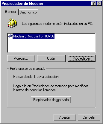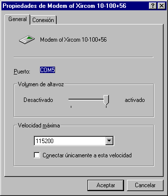 Se selecciona la pestaña "General", y dentro de ella, el módem cuya velocidad de puerto quiere limitarse (en la figura del ejemplo se trata de un módem Xircom de 56 Kb montado en una tarjeta PC-CARD que incluye también un adaptador Ethernet 10/100). A continuación se selecciona el botón "Propiedades", y aparece un cuadro de diálogo como la figura 4. En la parte inferior (Velocidad máxima) puede seleccionarse la velocidad DTE.