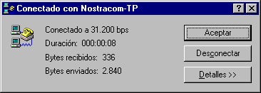 Sin el concurso de utilidades especiales generalmente no es posible conocer la velocidad actual de comunicación. En el caso del acceso telefónico a redes de Windows, mientras que está abierta la comunicación aparece un icono en la barra de tareas (junto al reloj). Pulsando sobre él con el botón derecho aparece un menú contextual en el que seleccionando "Estado", aparece una ventana informativa en la figura 7; junto con otros datos se muestra la velocidad de conexión en ese momento.