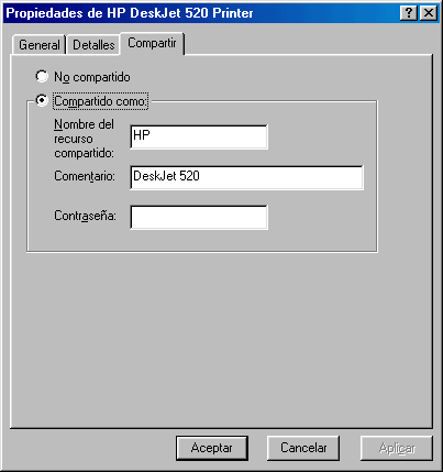 puede hacerse en Mi PC Aparece un cuadro de diálogo como el de la figura 8, debemos seleccionar el botón Compartir como. Es posible escribir un nombre, un comentario y una contraseña. Como Nombre puede utilizar el nombre sugerido o escribir otro nuevo [1]. Cuando alguien desee utilizar esta impresora, buscará este nombre al ver su equipo en la red. El Comentario es un espacio para que pueda incluir algún dato acerca de la impresora compartida, de forma que el resto de usuarios podrán leerlo si ven su impresora en la red, bien en el cuadro de diálogo Propiedades de la impresora, o haciendo clic en la opción Detalles del menú Ver. Puede utilizar el comentario para identificar la impresora. Por ejemplo, puede indicar el tipo de impresora y su ubicación. La Contraseña es la clave especifica que otras personas necesitan para utilizar la impresora compartida. Si no desea utilizar una contraseña, deje este cuadro en blanco.