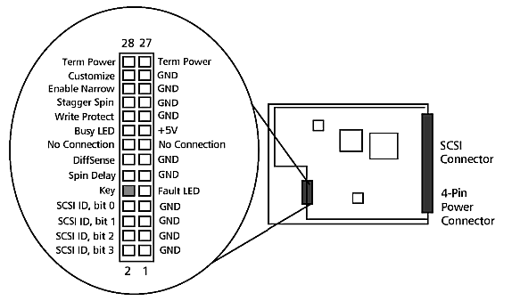 Los más importantes y frecuentes son los que se citan a continuación. Aunque debemos advertir que algunas unidades SCSI tienen características especiales que se controlan mediante jumpers adicionales, y que algunas otras los han sustituido por comandos software que son enviados mediante el adaptador host. Es frecuente que los jumpers de estas unidades estén agrupados en lo que se denomina el bloque de opciones ("option block").
