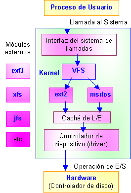 La figura adjunta muestra el esquema de funcionamiento. En su interlocución con el Kernel, el proceso de usuario utiliza una interfaz homogénea que no cambia (interfaz del sistema de llamadas). A su vez, esta interfaz traslada las llamadas al módulo correspondiente a través del VFS. En la figura son los módulos ext2 y msdos, aunque puede cargarse cualquier otro sistema de ficheros que hayan sido incluido en la compilación del núcleo (señalados como "módulos externos" en la figura). Mientras no son cargados, estos módulos permanecen en el disco junto al resto de módulos del Kernel, como ficheros especiales.