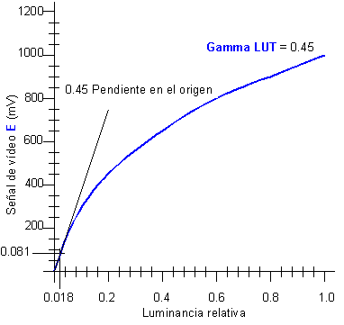 Puede verse que la tensión de salida E es igual a la luminancia teórica L elevada a un exponente Lg denominado gamma LUT, cuyo valor puede oscilar entre 5 y 0.25 aproximadamente (1 es la corrección nula). Un valor usual es Lg = 0.45. Su inverso es denominado factor de corrección gamma Cg, o gamma del sistema (SO gamma). La mayoría de los Sistemas Operativos permiten que el usuario pueda manipular estos valores.