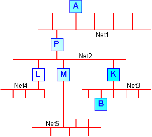 Nota: Por regla general P conecta con una red cuyos nodos son a su vez pasarelas. Dicho en otras palabras: P dispone de conexión con Net1 y otra conexión con una red Net2 cuyos nodos son también pasarelas. Es la situación indicada en la figura 7 donde la subred Net2, que en este caso actúa como "Backbone" de la organización, está conectada a las pasarelas P, K, L y M.