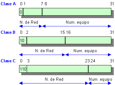 Como puede verse en la Fig.2, cada clase asigna un espacio distinto para la identificación de red y de host, dentro de los 32 bits disponibles: 8, 16 y 24 bits (1, 2 y 3 octetos) para la identificación de la red en las clases A, B y C respectivamente. Por consiguiente, se reservan respectivamente 3, 2 y 1 octetos para la identificación del equipo en cada una de las clases.