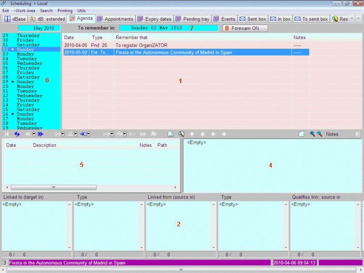 La figura 1 muestra el aspecto de la pestaña de Agenda. Observe que con respecto a la ventana principal de dBase, solo ha cambiado el espacio ocupado por las ventanas superiores, mientras que la parte inferior de la pantalla, sigue mostrando el campo de Notas (4), el de Bitácora (5) y las ventanas inferiores de enlaces (2).