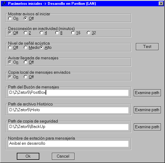 Nota: si elige aceptar (Ok) al terminar la configuración y está trabajando en su área local (sus parámetros iniciales), es necesario que reinicie la aplicación con objeto de que los nuevos datos puedan tener efecto. El no hacerlo así puede originar que en determinadas circunstancias, puedan producirse errores fatales (no recuperables) en la aplicación.
