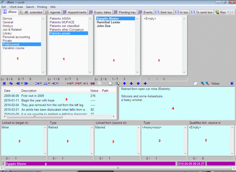| Nota | Además de los atributos correspondientes, cada email puede ser asociado con una nota; campo texto con una longitud máxima de 1.500.000 caracteres. La columna Nota de la ventana de emails muestra el número de caracteres que contiene la celda correspondiente (---- si está vacío). Cuando se da foco con el ratón a un email, la ventana 4, que normalmente contiene la nota del ítem de dBase, pasa a mostrar el contenido de la nota del email. | |||