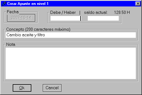La primera vez, que corresponde al primer asiento del apunte, se puede establecer la fecha en el botón correspondiente y la cantidad en la ventana izquierda (Debe) o derecha (Haber). También el concepto e incluso una nota explicativa adicional.