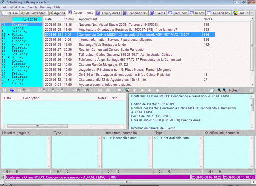 - Planificador: comprende Citas, Vencimientos, Pendiente y Efemérides (figura 2); en general todo lo que compone una agenda (scheduler) personal, incluyendo una página-resumen con los eventos a recordar cada día (Agenda).