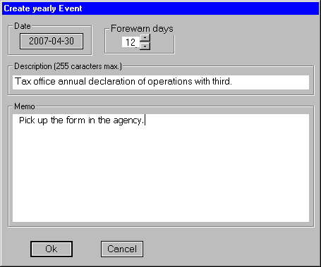 year-month-day, and a forewarn from 0 to 99 days. The event will be warned every year closer to
