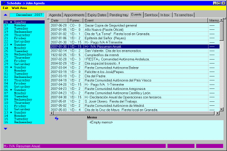 The events are issues to be remembered, which occur on certain days and with a fixed frequency. Usually relate to such matters as saint's days, anniversaries, reviews, etc. The Zator Planner has the advantage that only is necessary to annotate them once, so that we are remembered forever within the time forewarn settled. In addition to the elements common to all events of the planner, a text of a line (event) and a note (memo), the events have a date, which corresponds to its first occurrence; a forewarn in days, and depending on its type, a mechanism to establish its periodicity.