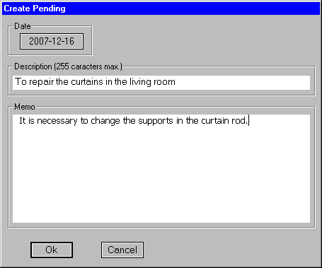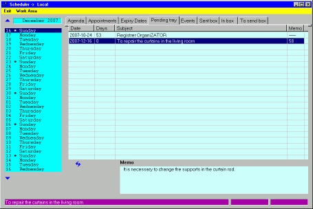 The events of this group represent issues that should not be forgotten, but who have no specific date for completion. Usually correspond to that sort of thing who politicians promise to never do, or those others, such as leaving the tobacco, which we intend make but whose date of completion is uncertain. In addition to the elements common to all events in the planner, a text of a line (subject) and a note (memo), the outstanding issues have a date, which corresponds precisely with the date of his creation.