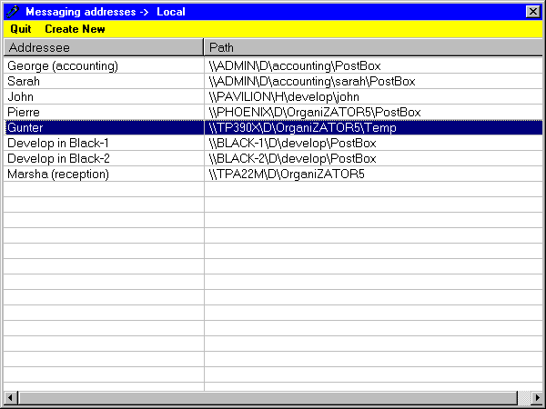 The Zator's messaging system uses the addresses contained in a list of the local work area, as menu for possible destinations for messages outgoing from the station.