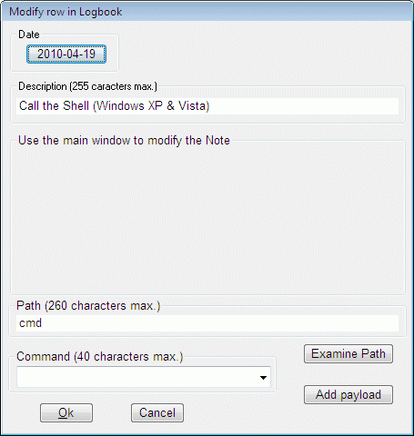 When selecting any of these options, is obtained the window shown in Figure 2, which can be defined/modified the various elements: Date; Description; Note (*); Path and Command, which make up an element (row) of the log, and that has been described briefly in Components of an item.