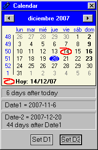By pressing the button Set D1, the date pointed out by the calendar at that time is entered in the second window. If you change the pointed date and then click the Set D2 button, the new date is stored in the third window, which shows the difference in days between the dates selected (D1 and D2). In this way the system allows easily perform date calculations. For example, time limits more or less in regard to the current time, or distance between any two dates.