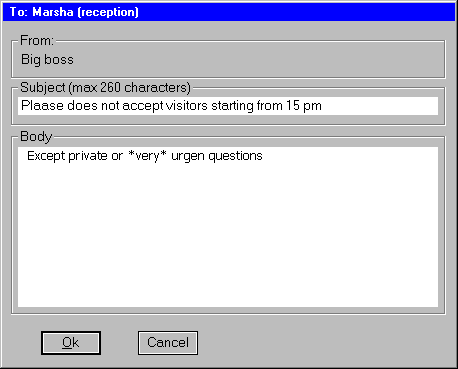 Notice that the title of the window shows the addressee (To: Big Boss) who was selected in the previous menu, and that the system automatically fills in the area of origin (From:) with the sender's name. This latter value is taken from the parameter Station's name to messaging of the Initial settings of the sender's local area.